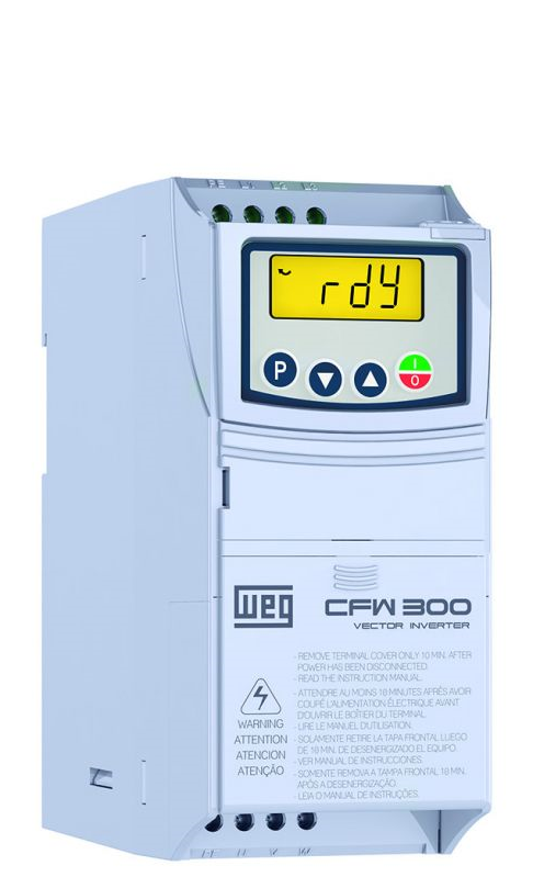 O inversor de frequência CFW300 é um acionamento de velocidade variável de alta performance para motores de indução trifásicos, ideal para aplicações em máquinas ou equipamentos que necessitam de controle preciso e facilidade de operação. Possui tamanho compacto, instalação elétrica similar a contatores, controle vetorial WEG (VVW) ou escalar (V/F) selecionável, interface de operação (IHM) incorporada, SoftPLC, software de programação WPS gratuito e acessórios tipo plug-in que podem ser incorporados, agregando mais funcionalidades, proporcionando uma solução flexível com excelente custo benefício.